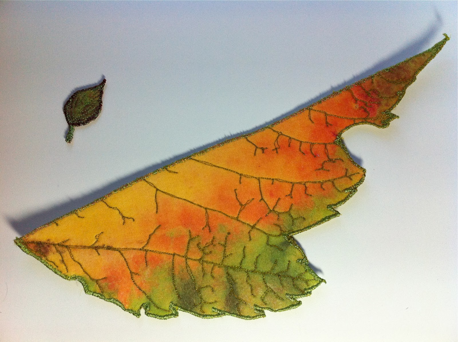 Step 5- Free motion quilt the veins of each leaf. Straight stitch around the edge, cut it out, then free motion zig-zag around the edges.