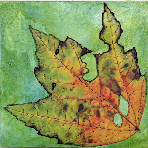 Step 7- Borrow a friend’s machine, finish the edges. Use matt gel medium to glue each leaf to the painted canvas. Paint over the whole thing with gloss gel medium. I think I like the shine and it gives the leaves a bit more richness and depth but the stitching is still a wonderful element.