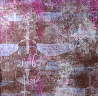 The problem, after cutting out the section she liked, was that there really wasn’t a focal point. No real place to rest the eye. She had nixed a larger black print of a violin and favored a more subtle look. I think I’ve got it figured out now and am excited to begin stitching into it.