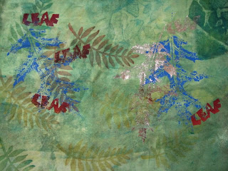 Christina, who is an art teacher herself and had already done some wonderful printing on fabric, added even more leafy screen prints, both with paint and foil, and carved a great stamp.