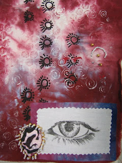 Jocelyn layered carved and commercial stamps, photo-transfer, and foil on her funky art quilt.