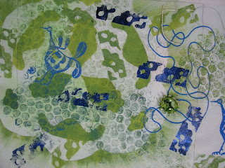 Debbie went to town – layering bubble wrap prints, carved stamps, stencil resists and screen prints.