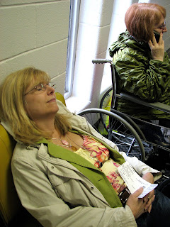 Teaching can really wear a person out. Bonnie McCaffery (who teaches beginners to make amazing painted portraits on fabric) is taking a break waiting, and waiting, and waiting to see if our plane would take off. Remember those tornadoes in the middle of the country a week ago? They really messed up air travel. Our plane was delayed for a good two hours. Esterita Austin (one of my favorite artists!!!) was so stressed out by her teaching schedule (she had another gig in Vancouver, B.C. to get to) that she immediately aged forty years – thus the wheel chair. No. Just kidding – it was just a comfy place to sit.