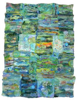 J: Needle and thread. I started as a watercolor artist, and as I moved into collaging my watercolor paintings, I started sewing on the paper. Now I also sew on fabric.