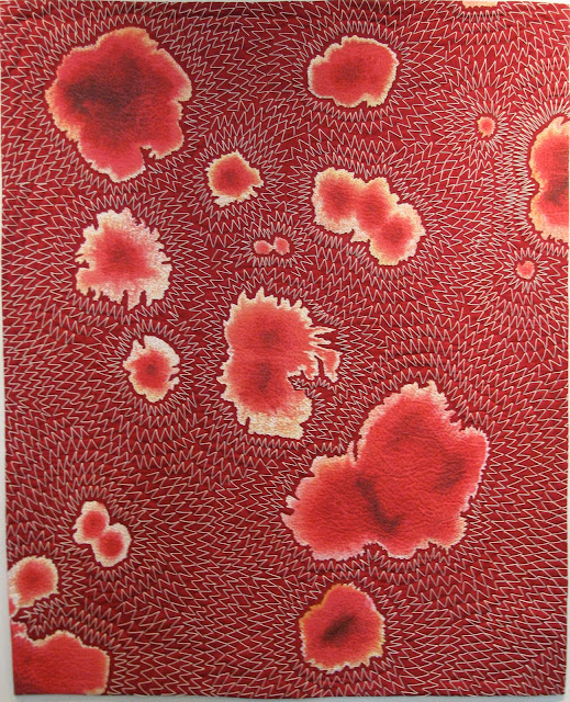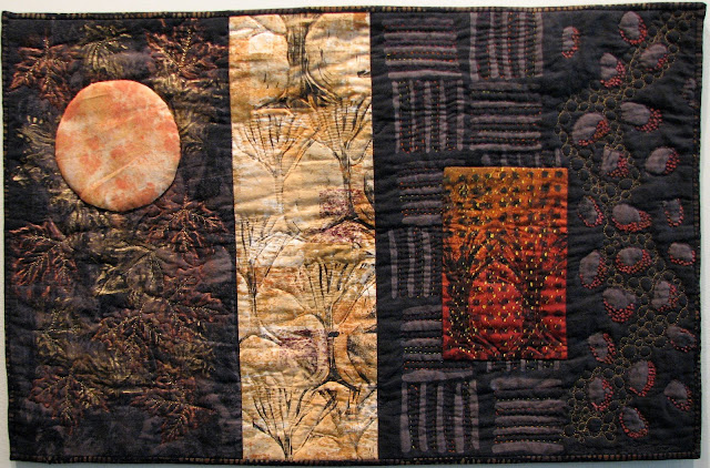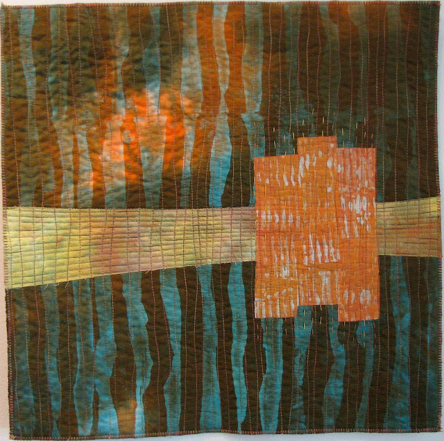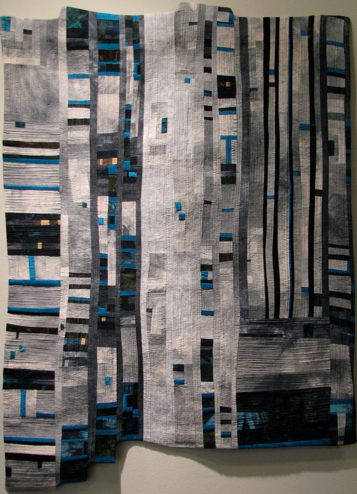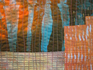 Line, both broken and continuous holds all of my fascination here. The dense stitching flattens out the texture of the artwork but brings a continuous vertical feeling to a rhythmically irregular piece. That and I tend to love subdued color scheme.