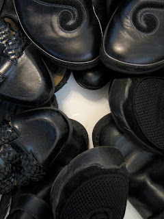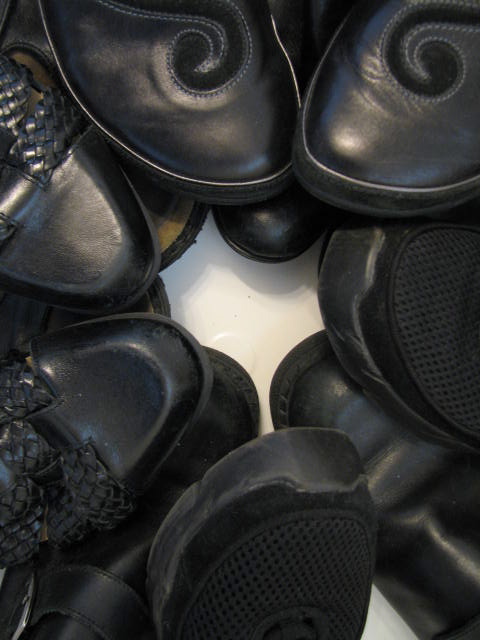 In a fit of pain years ago I made a pledge to myself not to wear shoes that hurt. Now I hunt and hunt and hunt and when I find a pair that fits my little heart goes pitter pat. I buy them and wear them and wear them and wear them and wear them. Because it is so hard to find shoes that fit I have included shoes as part of my “underwear.” In other words, they are the boring blank canvas over which the cute stuff goes. Winter is black shoes, pants, shirt – and a really cool jacket. I have a black pair of clogs for winter, black boots for church, and black sandals for summer. I have cute black flats for when I know the summer AC will chill my tootsies. I did keep one pair of pointier dressy sandals for emergency situations. Sigh.