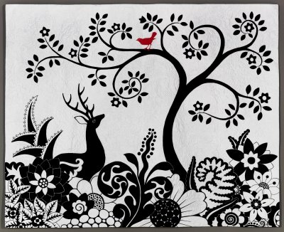 J: I derive a lot of inspiration from my life experiences and fascination with global cultural traditions and mythology. When I was 12, my family moved out of our house, put everything in storage and drove to Guatemala, traveling through the US, Mexico and Canada, 18,000 miles in all. We spent a year on the road and rented a house in Antigua Guatemala, studying the arts, culture and archeology of these countries. My mom and I also spent time learning back strap weaving from Indian women in Guatemala. In college I went to Japan to study graphic design and now I have just returned from teaching in New Zealand, I find that it all influences me in some way.