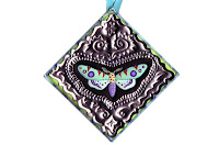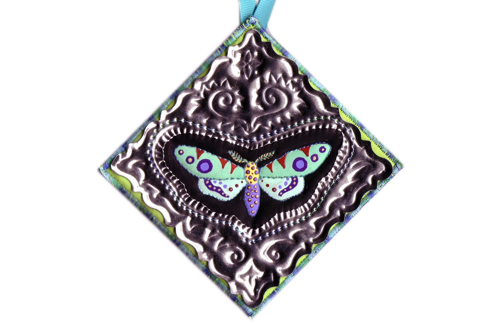 Inspired by Mexican tin folk art, these fun and festive ornaments incorporate painting with textile paints, quilting, embossing and sewing metal.