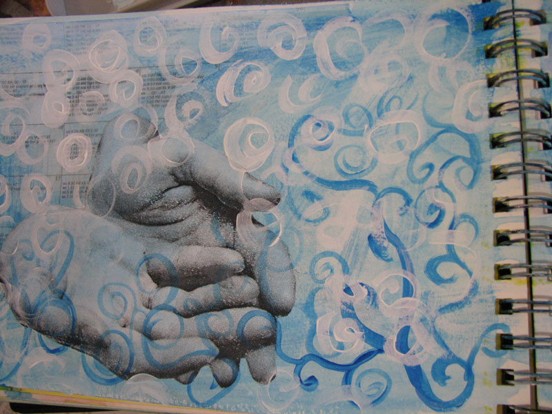 5- More acrylic in a transparent blue and an opaque white – swirls in with a brush – like time swirling all around me and away.