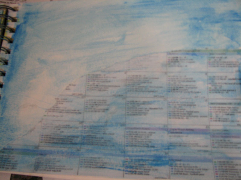 1- The calendar gets glued in. Painted over with a bit of gesso. Oops. Now I remember that ink-jet prints smear when wet. Ah well, so be it. Find a couple of my favorite pics.