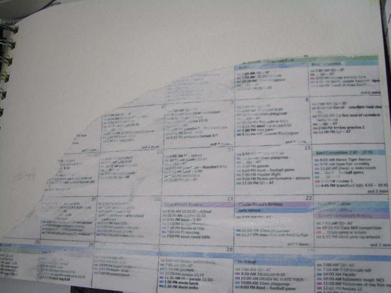 The first bit glued into my sketchbook? My usual schedule. It looks like that through next June. Five kids and a part time career will do that to you. Time is flying by and I often feel I’m missing it. My oldest daughter just applied for college. I’m feeling a little … something. Excited? Yes. Apprehensive? Just a tiny bit – she’s prepared. Bushwhacked? When did she grow up!?!
