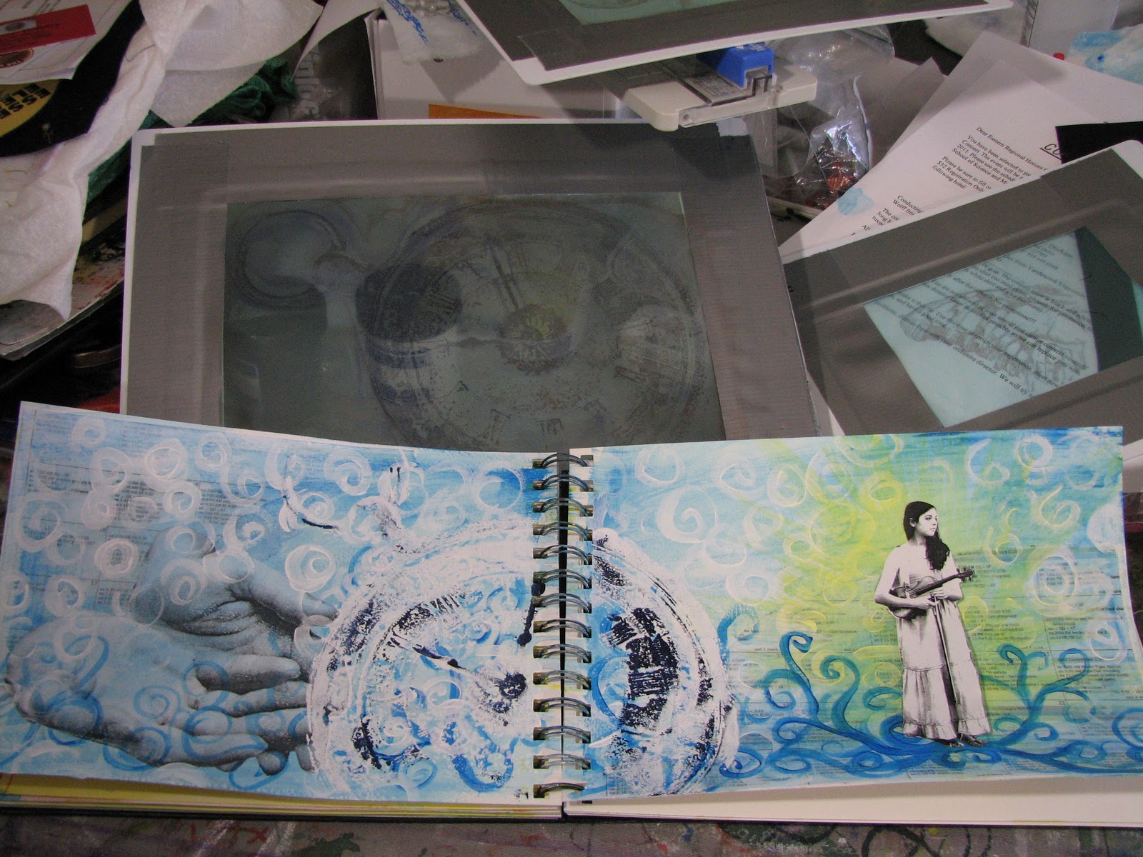 6- Hunt through my stack of screen for the perfect image. Ah – there it is. This time I used it like a stencil, first with the white opaque paint, then a navy transparent. It was a pain having the wire binding loops right in the way. I’m seriously thinking of working with loose sheets then binding them as shown in Jane Davie’s tutorial. When I find some time.