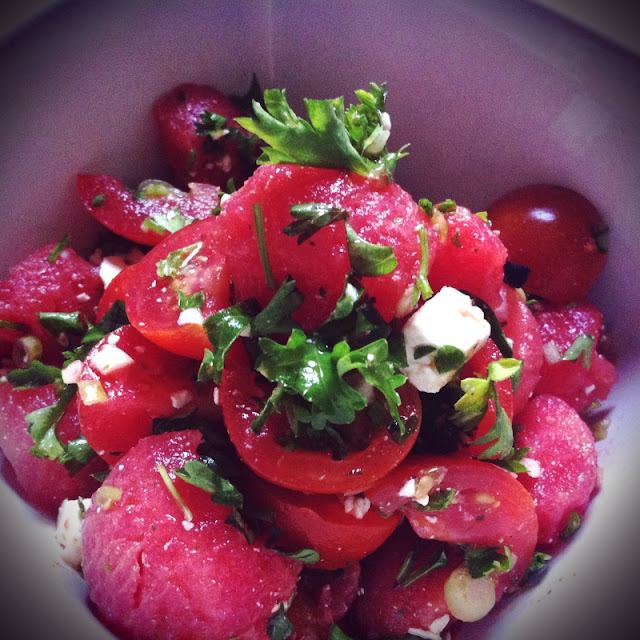 For Your Inspiration: Summer Wonderful Salad July 13, 2011 Summer Wonder Salad 3 cups watermelon 2 cups cherry tomatoes 1/2 cup fresh parsley 1/4 cup feta cheese 2 Tbsp scallions 2 Tbsp olive oil 1 Tbsp balsamic vinegar 1/4 tsp cayenne pepper chop, mix, chill…. divine! by Lyric Kinard