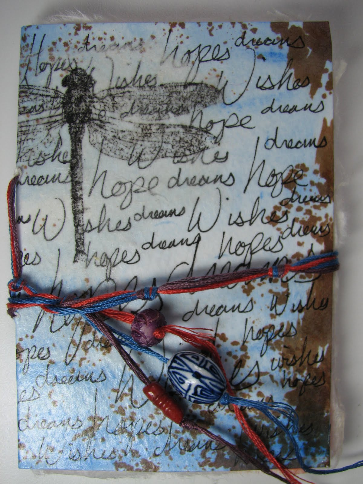 dragonfly transfered onto rice paper adhered to book cover with gel medium |
