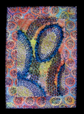 beaded, painted/printed fabric, hand embroidery, mixed media