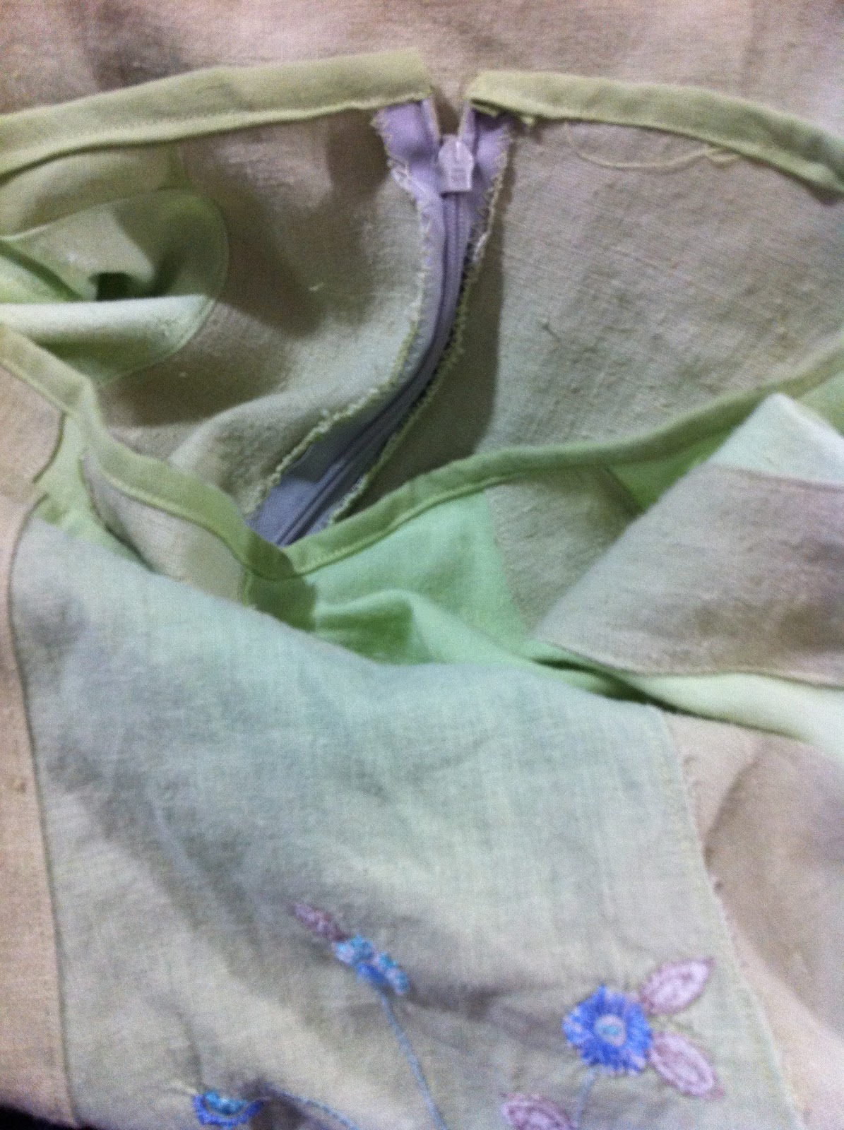 Granted, some of the seams are inside out and some outside in on this upcycled garment made from old linen shirts in my interpretation of the boro spirit. That confuses the issue a bit. But I purposefully held the skirt up, placed the zipper, looked at it carefully and distinctly told myself to make sure I do it on the correct side. And promptly proceeded to sew it inside out.
