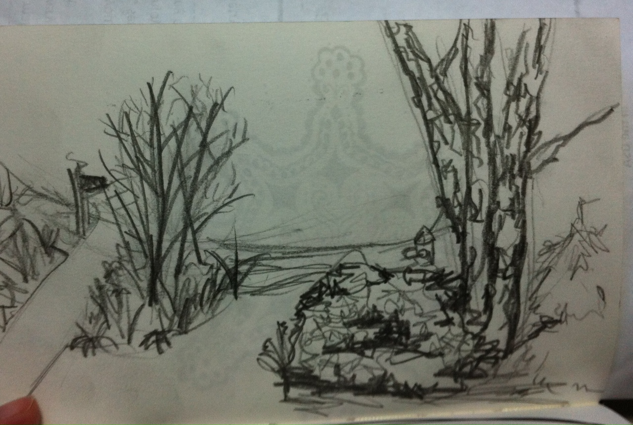 Sometimes I doodle what I see out my window as I’m talking on the phone. It’s a sketch of a landscape through a window but it’s also killing time so it might be called a doodle. I don’t think it really matters.