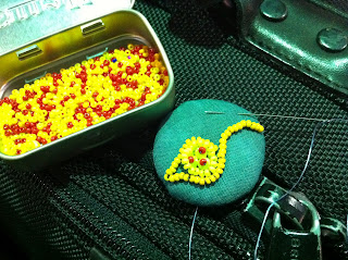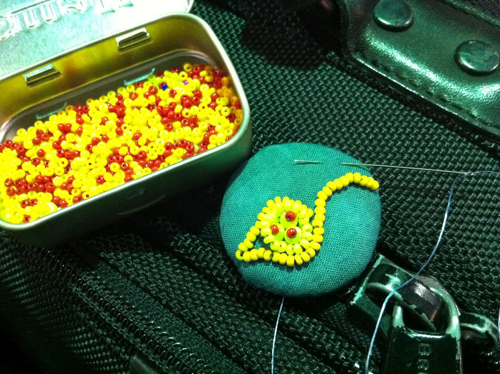 Just like many of my projects – this one began in an airport. Am I the only traveller that doesn’t mind sitting and waiting in an airport? It’s one of the few times I’m alone with no demands on my time. Perfect for a little bead project. Beaded fabric projects are beautifully portable.