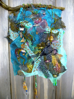 I’m currently working on a relatively large piece that I’m hoping to have accepted into a juried show next year.  This piece was inspired by some of the needle felted work done by Jane LaFazio.  I’ve started with hand dyed pieces of left over bamboo batting as a base.  Over that I’ve layered all sorts of wonderful yarns, wool and silk rovings, hand dyed cheese cloth, etc.  The next step will be to add a lot of hand stitch and then some beading.  I love the unpredictability I get when working on my embellishing machine.  It’s so much fun to watch the piece evolve in front of my eyes!