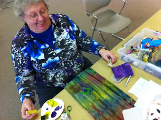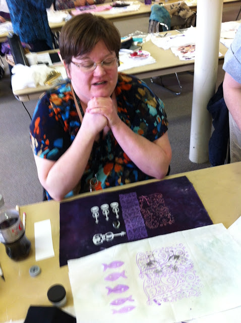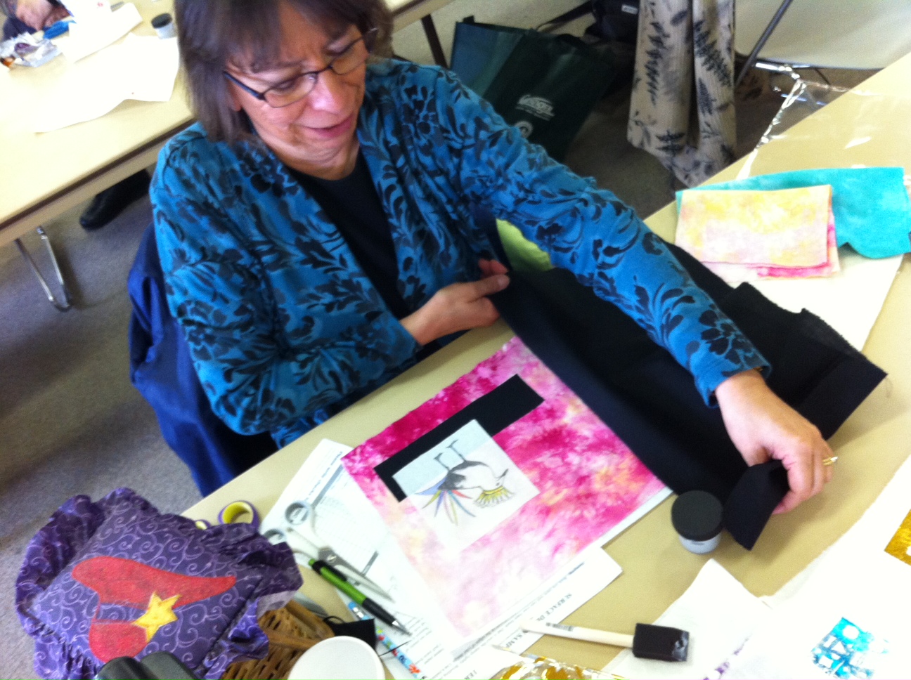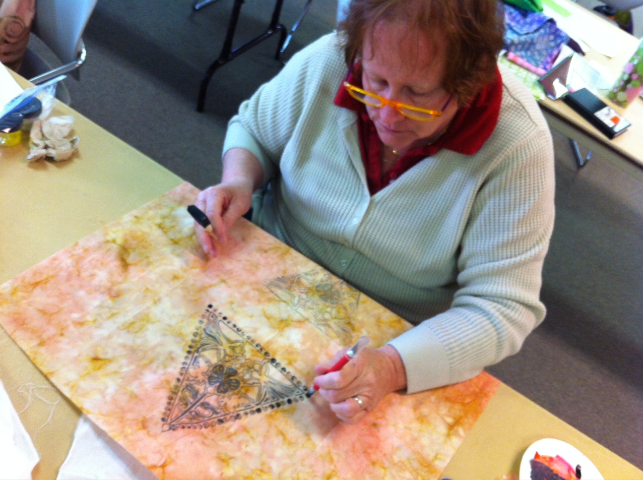 | Working out a design for a small art quilt – she’s colored in her photocopy transfer with colored pencils. |