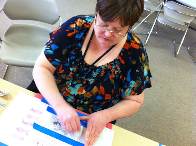 | Getting creative – adding a decorative boarderstamping paint with the end of her knife around a photocopy transfer |