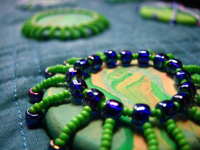 Come learn the basics of beading and create a fun little art quilt. You will learn techniques for adding beads of all shapes and sizes to your quilts and wearable art, easily and after you are done quilting. Here’s the prize: no knots or mess on the back! Learn to embellish in a way that adds to the overall design instead of looking like an afterthought. Class price: $55 (includes kit fee)