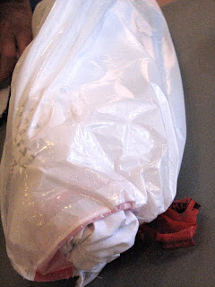 I have heard of instances of pieces being accidentally thrown away, mistaken for garbage. If you have no other choice a garbage bag will protect your work from moisture. Just label it in great big letters. It’s much better that the bag be clear.