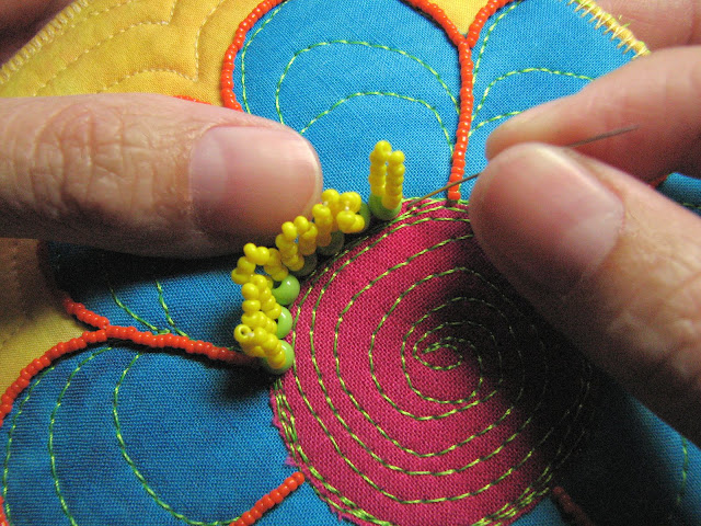 Are you a quilter? Foil the quilt police and learn to bead from the top of a finished quilt with no knots or mess on the back