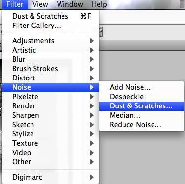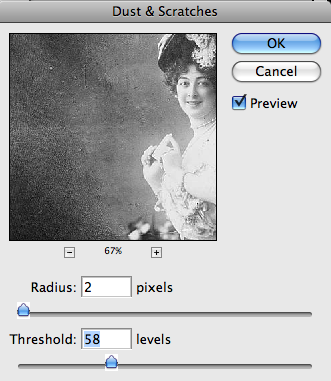 Now look up in the menu bar for Filter, Noise, Dust and Scratches. This filter is going to find all those white spots and fill them in with the same colored pixels that surround them. You’ll see a control panel that looks similar to this.