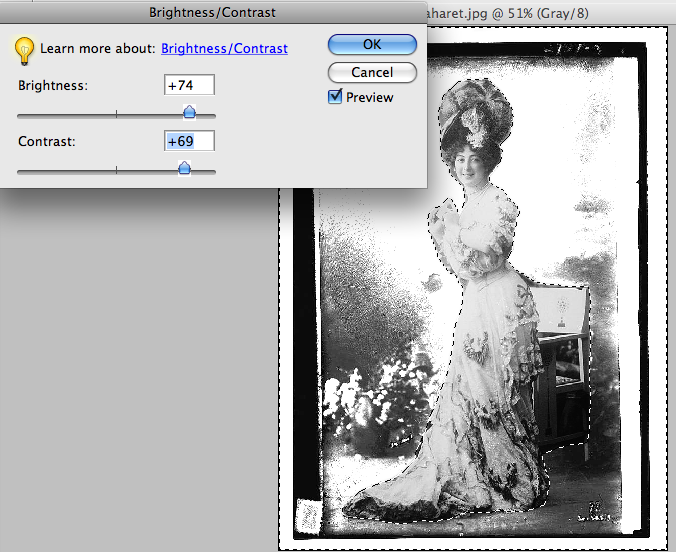 With your select tool still glittering away around the background go ahead and play with your Brightness and Contrast sliders until you’re happy with what you are seeing. My objective was to keep the flowers and chair but lighten the background considerably.