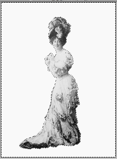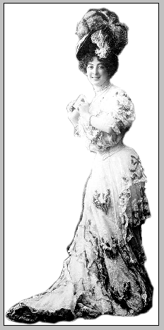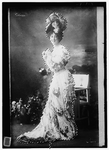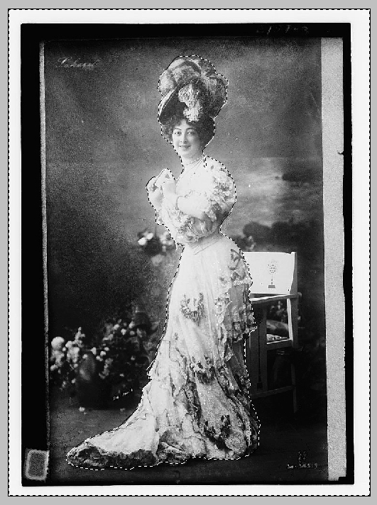 Remember the lovely Saharet? This is a copyright free image courtesy of the Library of Congress’ Flickr site. In the last tutorial I mentioned that while there is great contrast here, too much black ink might bleed. Just for kicks, let’s pick Saharet out of her background and use her all by herself. It’s a little painstaking but nothing too difficult.