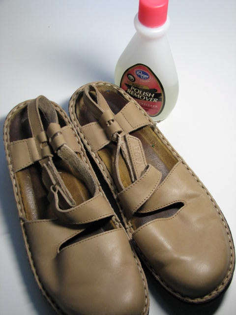 Take the shoes and clean them up as much as you can then rub a little nail polish remover all over them . It roughs them up and removes any finishes so the paint will stick to the leather.