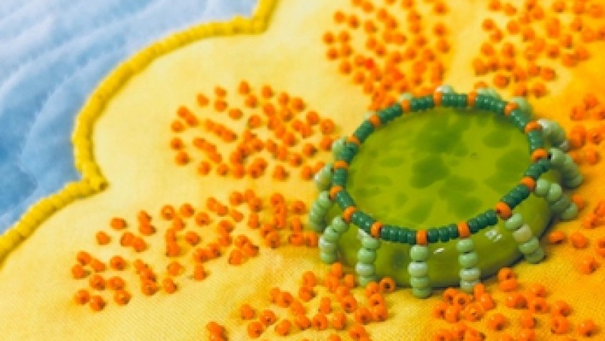 The basics of beading on cloth: including creating a simple beaded bezel to cage a cabochon.