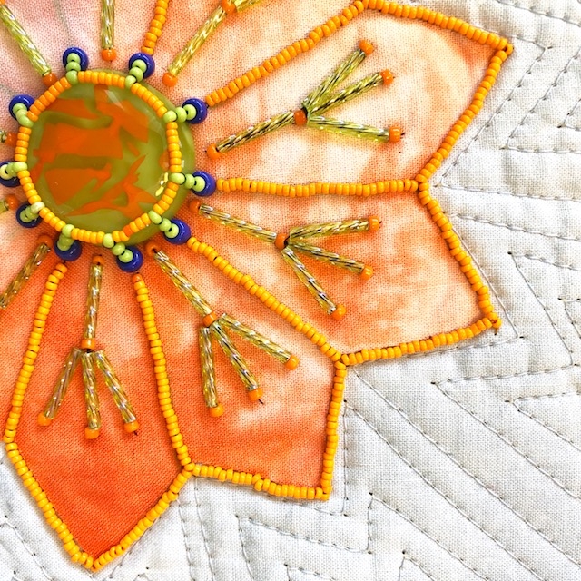 You’ll start by creating a playful fabric flower collage on batting, then dive into a variety of beading techniques—all designed to enhance your design, not distract from it. Learn how to stitch beads in clean lines, tame tricky bugles, and even secure a cabochon with a stunning beaded bezel.
